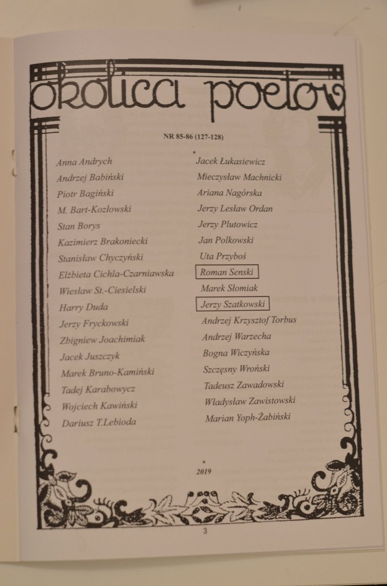 2 kwietnia 2019 r. zmarł redaktor naczelny „Okolicy Poetów”,  Jerzy Szatkowski. Był wybitnym poetą i prozaikiem. W 1998 roku reaktywował czasopismo, które przed wojną wydawał autentysta, Stanisław Czernik.