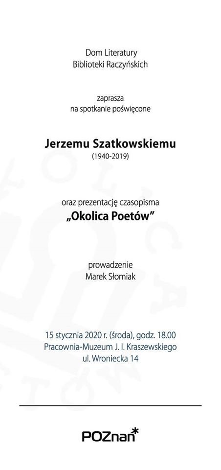 The post Spotkanie poświęcone Jerzemu Szatkowskiemu – Dom Literatury Biblioteki Raczyńskich first appeared on Okolica Poetów.